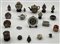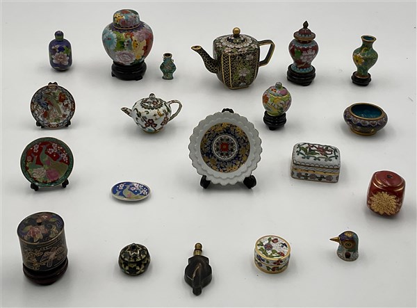 Scatola di oggetti vari in metallo smaltato cloisonnè e tre piattini in porcellana