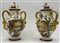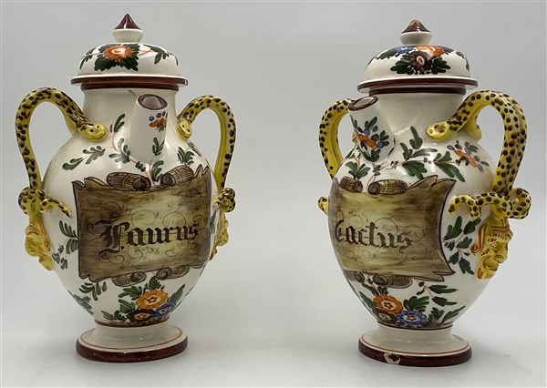 Manifattura di Este. Coppia di versatoi biansati da farmacia con coperchi in maiolica decorata in policromia (h. cm 29) (difetti e rotture)