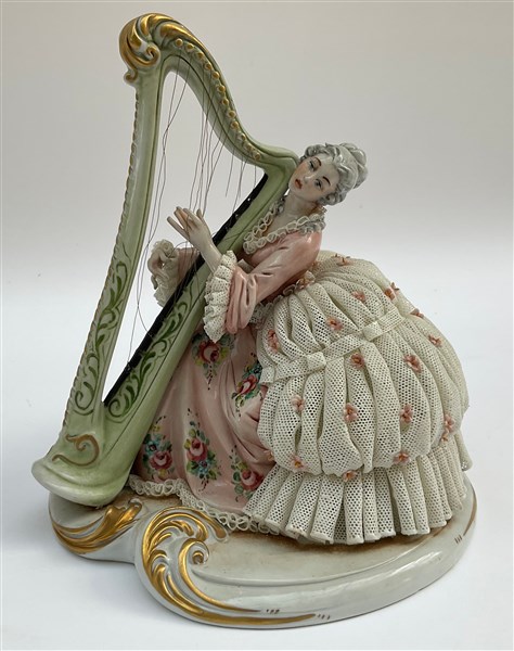 Scultura in porcellana policroma raffigurante una suonatrice di arpa in abiti s