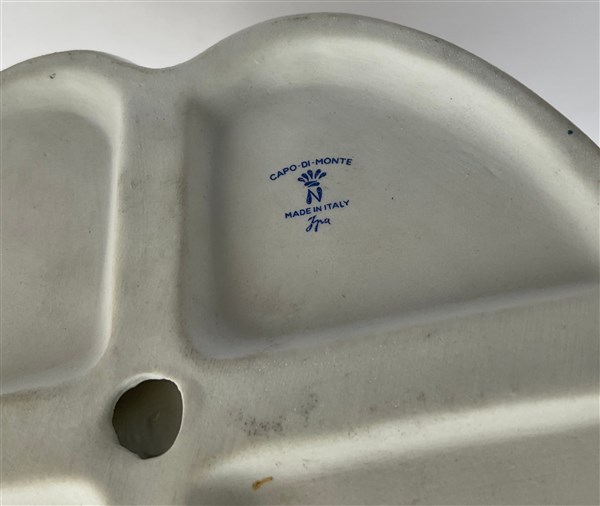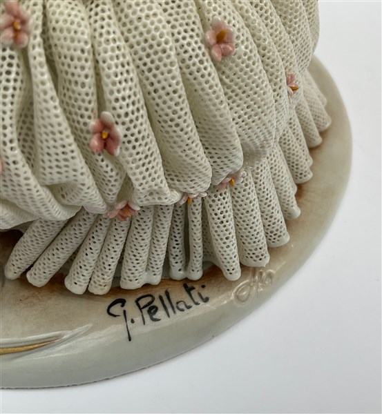 Scultura in porcellana policroma raffigurante una suonatrice di arpa in abiti settecenteschi, firmata G. Pellati (h cm18) (difetti)