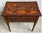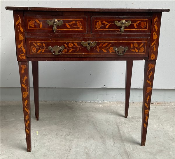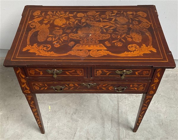 Tavolo da parete intarsiato in legni vari a volute e motivi fioriti. Un cassetto nella fascia sotto due a mezza lunghezza. Sostegni a obelisco rovesciato. Olanda, sec XIX (cm 74x75x47) (difetti)