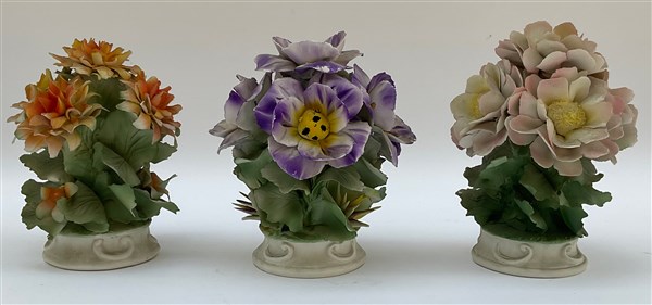 Lotto 3439 | Manifattura italiana, gruppo di tre composizioni floreali in porcellana policro