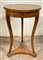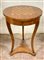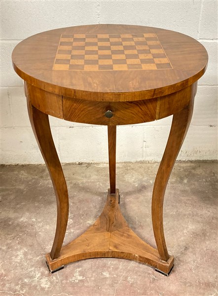 Tavolo da gioco lastronato in noce, intarsiato sul piano a scacchiera, fascia ad un cassetto, gambe mosse unite da pianetto. Secolo XIX (d. cm 53, h. cm 75) (lievi difetti)