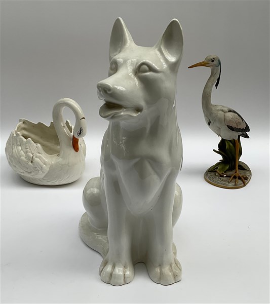 Lotto composto da una scultura in ceramica bianca raffigurante un cane seduto, una fioriera a forma di cigno in ceramica di Bassano ed una scultura in porcellana policroma raffigurante un airone ( h max cm 42) (difetti)