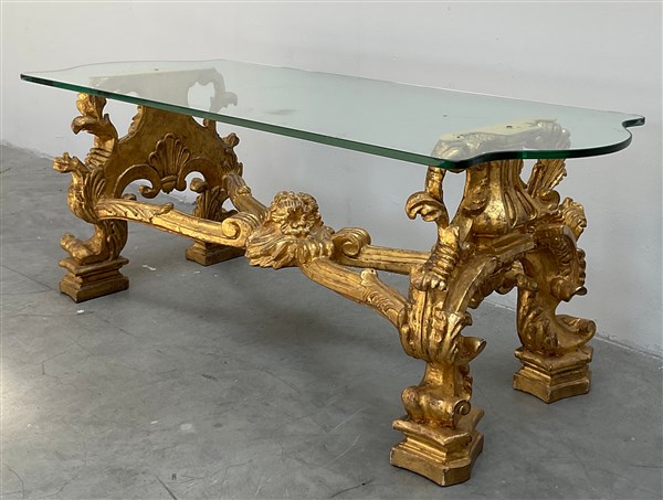Tavolino da salotto con supporto in legno dorato e intagliato a volute fogliate e riccioli. Gambe riunite da traverse sagomate centrate da mazzo di fiori. Piano in cristallo (cm 132x49x55) (difetti)