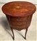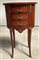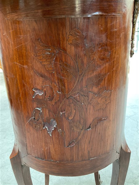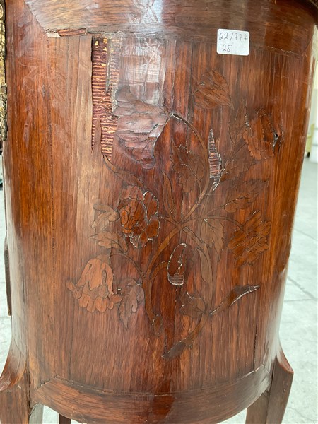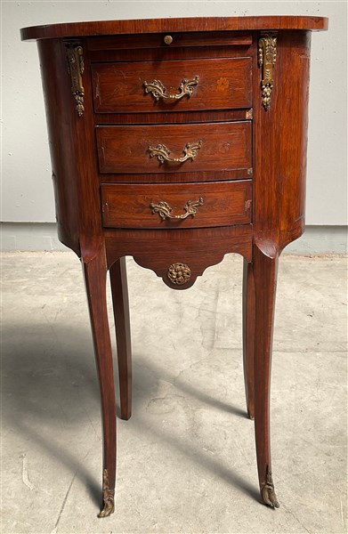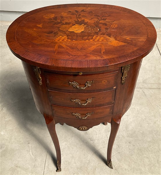 Tavolino intarsiato a cesto fiorito con piano di forma ovale e fregi in bronzo dorato. Nel fronte un cassettino sottopiano sopra tre (cm 51x83x35,5) (difetti)
