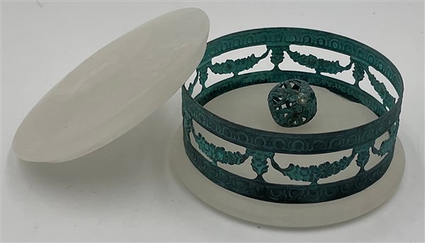 Scatolina con coperchio. Volterra, anni 2000. Alabastro e rame. Recante etichetta della manifattura sotto la base. (h cm 6; d cm 9) (difetti)