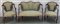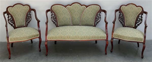 Fornitura da salotto di forma mossa in legno filettato e intagliato a volute fogliate. Composta da un divano e due poltrone con seduta e schienale imbottiti (difetti)