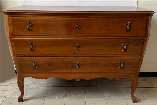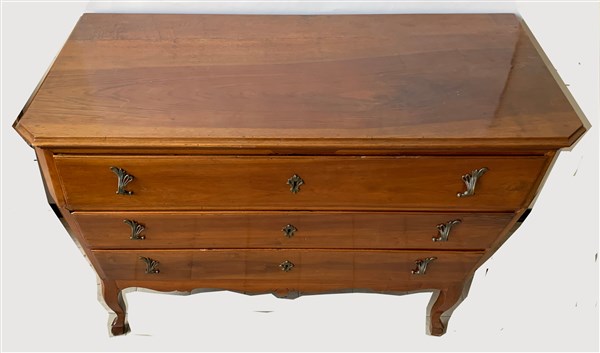 Commode in ciliegio a tre cassetti, fascia sagomata, piedi terminanti a zoccolo. Sec. XVIII (cm 130x88x60) (difetti e restauri)