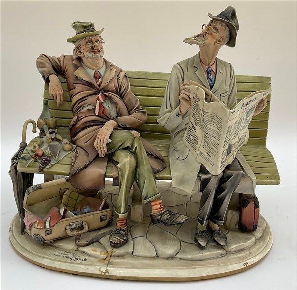 Tiziano Galli - Scultura in porcellana policroma raffigurante due uomini in conversazione su una panchina (cm 32x29x20), firmato alla base (difetti)