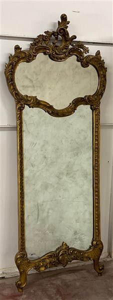 Caminiera di forma sagomata in legno intagliato e dorato a volute, fregi, motivi floreali e foglie (cm 182x756) (difetti)