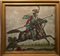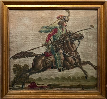 Ricamo piccolo punto in lana raffiugurante lanciere a cavallo (cm 43x39) in cornice lignea dorata (difetti e mancanze)