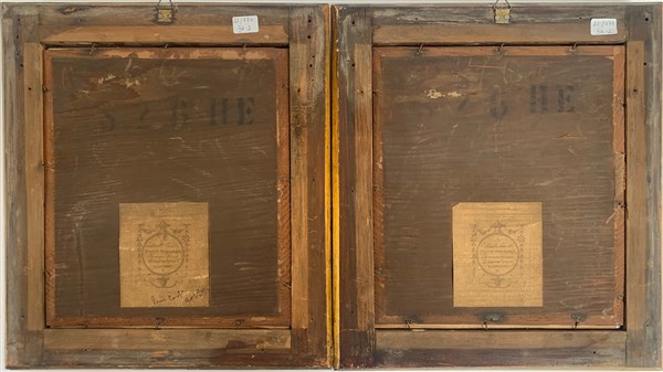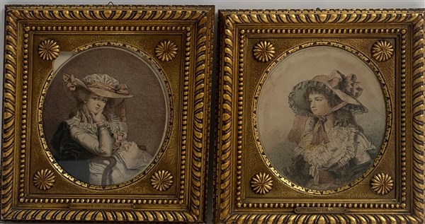 "Louisa" e "Thoughts on matrimony" Due stampe (cm 20x17) In cornice in legno intagliato e pastiglia dorata
