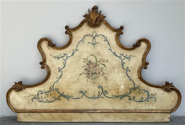 Testiera matrimoniale in legno intagliato, laccato e dorato a fiori e volute fo