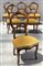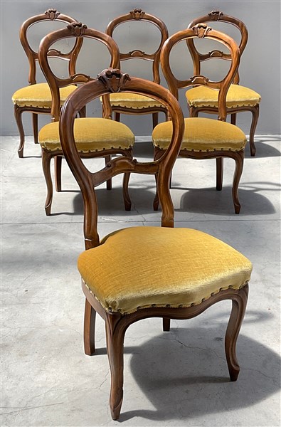 Gruppo di sei sedie in legno intagliato, schienale a giorno, gambe mosse (difet