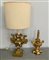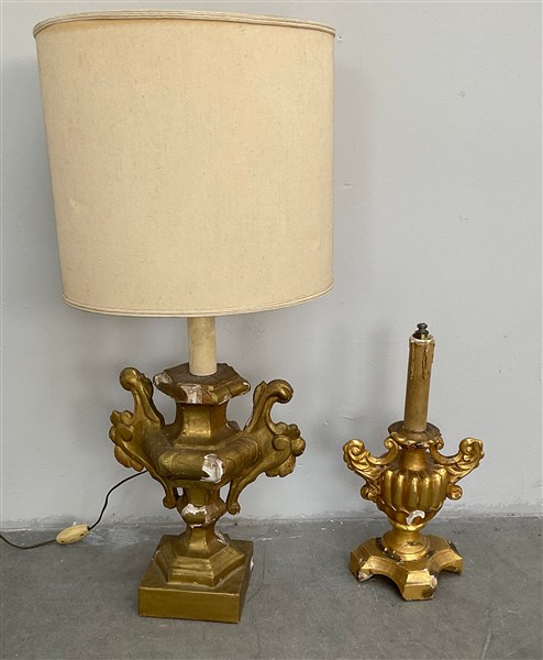 Due portapalme biansate in legno intagliato e dorato a volute fogliate (h. max cm 31) Elettrificate in epoca posteriore (difetti)