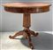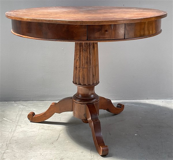 Tavolo in legno, cassetto nella fascia, sostegno a colonna rastremata su tre gambe terminanti a ricciolo (d. cm 99xh. cm 79) (difetti)