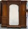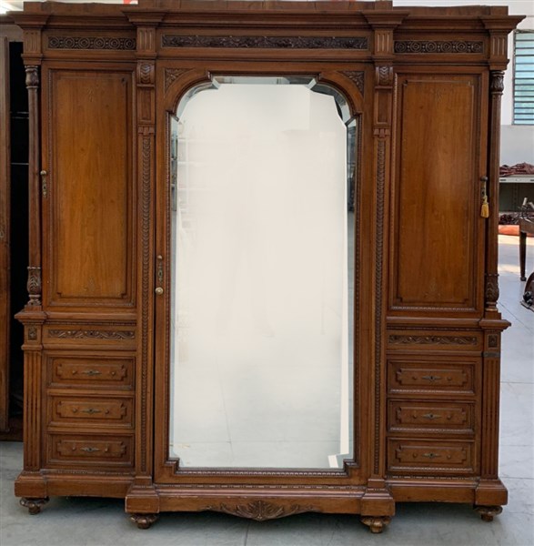Armadio in legno intagliato di struttura architettonica con anta centrale a specchio entro sportelli sopra quattro cassetti (largo cm 205) (difetti)