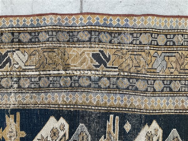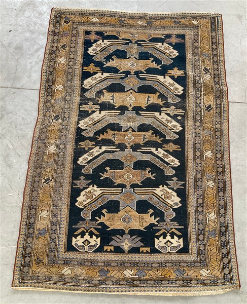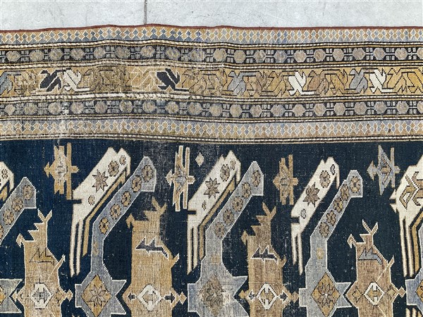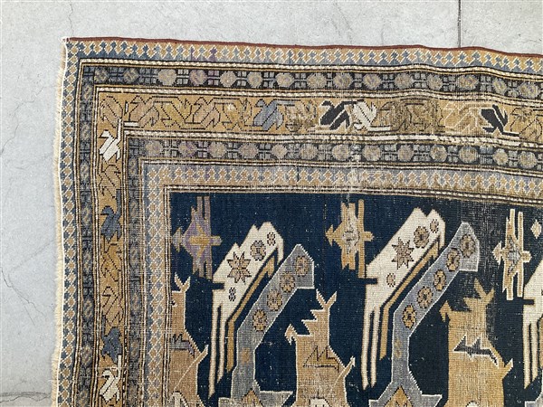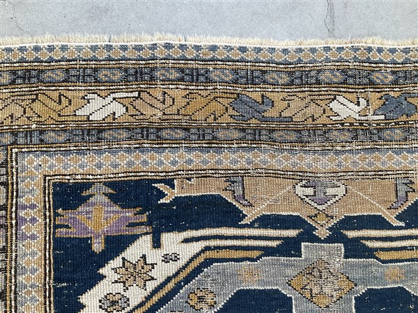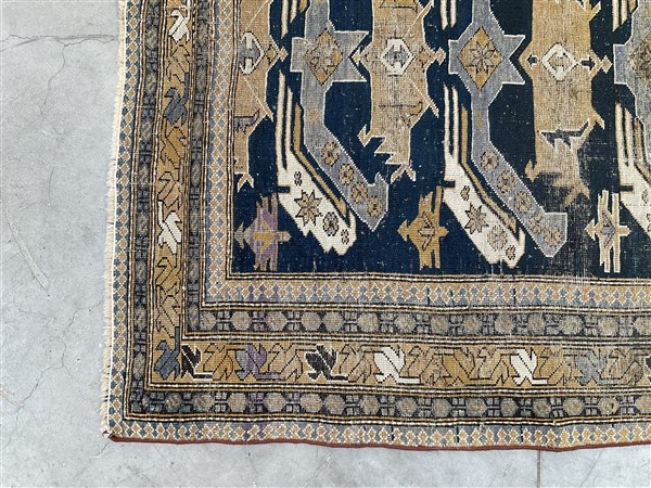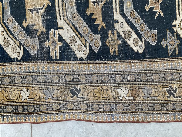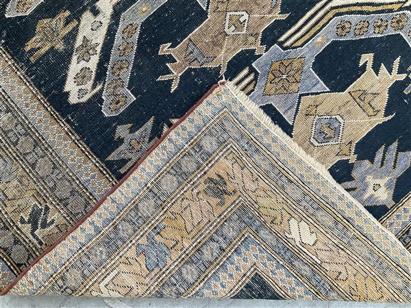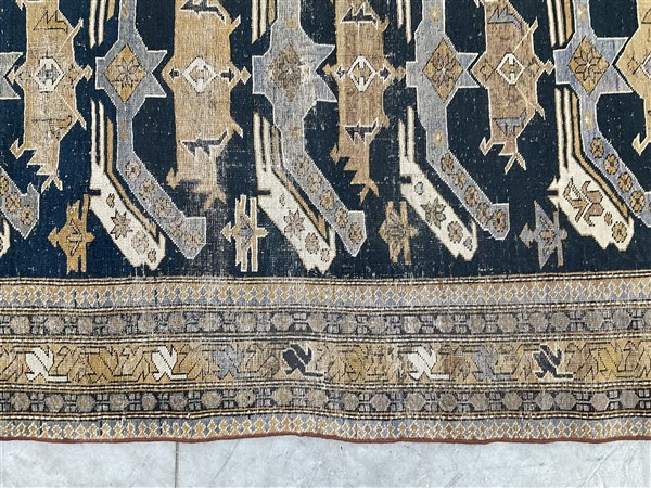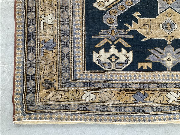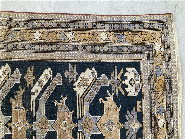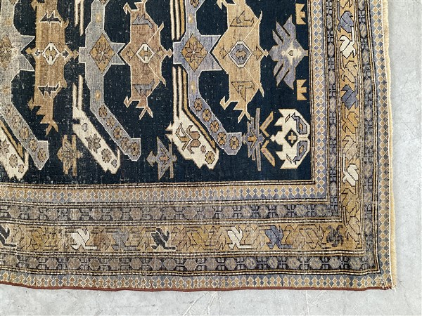 Tappeto Shirwan, Caucaso, fine secolo XIX. Decoro geometrico nei toni del lilla, nocciola e crema su fondo blu notte (difetti e rapature)