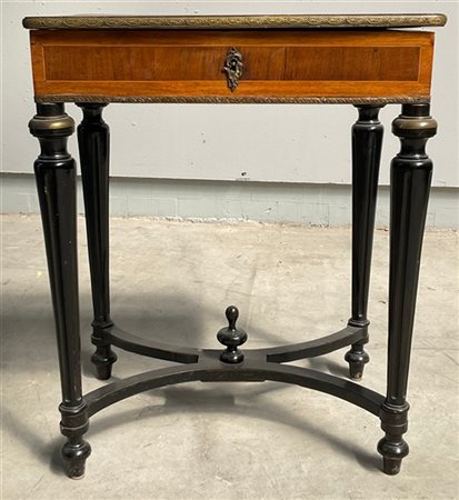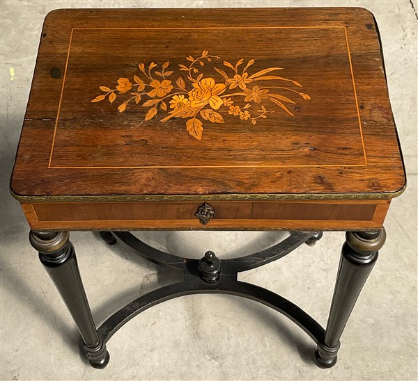 Tavolino da lavoro con piano apribile a ribalta in legno filettato e intarsiato a mazzo fiorito con profili in bronzo dorato. Gambe riunite da crociera centrata da pinnacolo in legno ebanizzato (cm 50x61x35) (difetti)