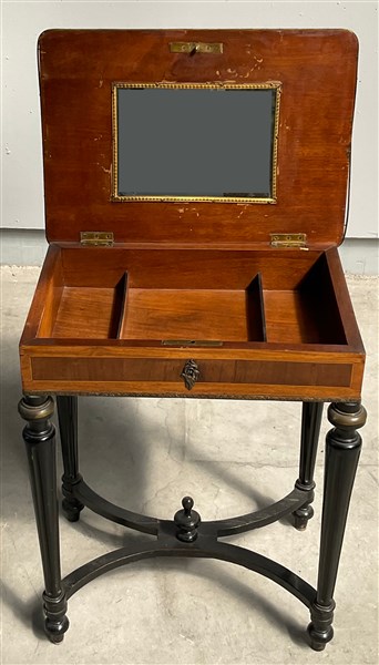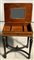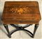 Tavolino da lavoro con piano apribile a ribalta in legno filettato e intarsiato