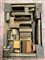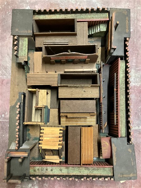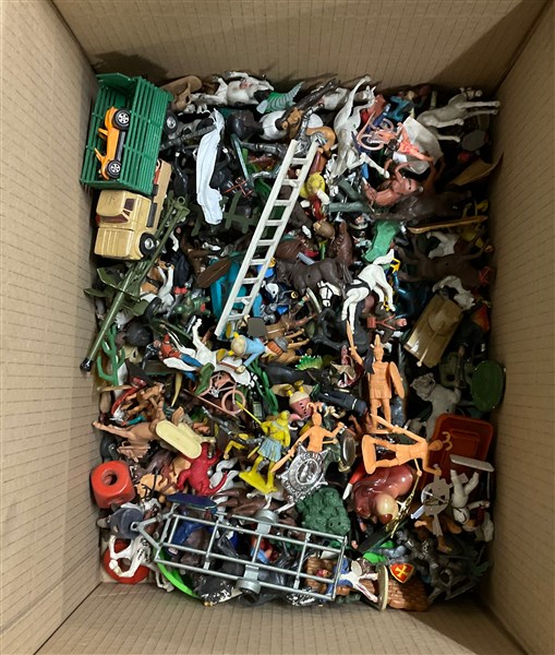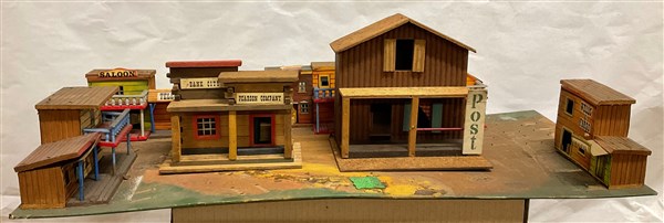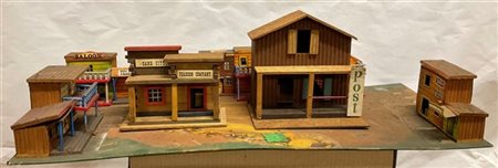 Lotto composto da un fortino giocattolo in legno dipinto, una cittadella del Far West con modellini di edifici in legno e cartone, ed un cartone contenente soldatini (difetti e mancanze)