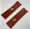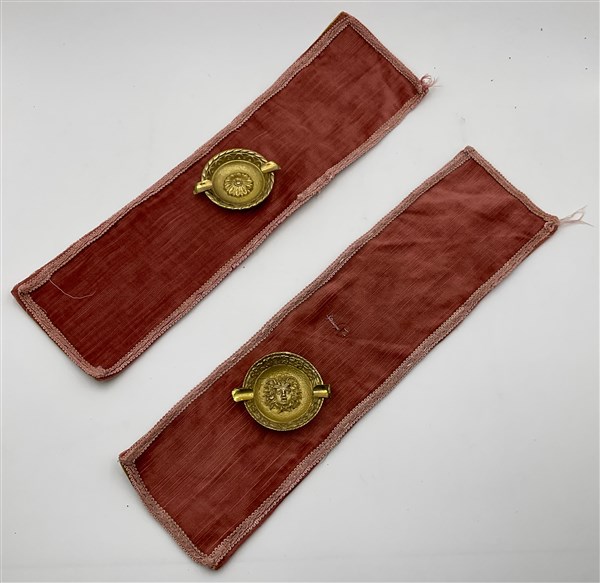 Due posaceneri da bracciolo in bronzo dorato decorati uno con il volto di Medusa e uno a fiore in rilievo (d. cm 9) Montati su tessuto (difetti e mancanze)