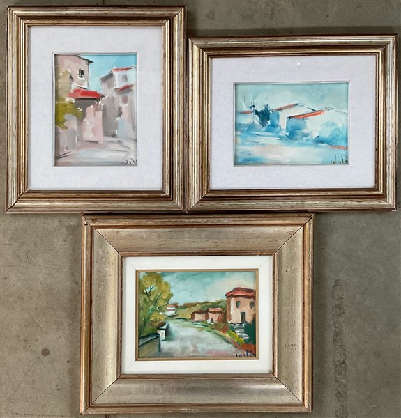 Firma indecifrata, lotto composto da tre dipinti ad olio su cartone telato raffiguranti villaggi (cm 18x24) firmati