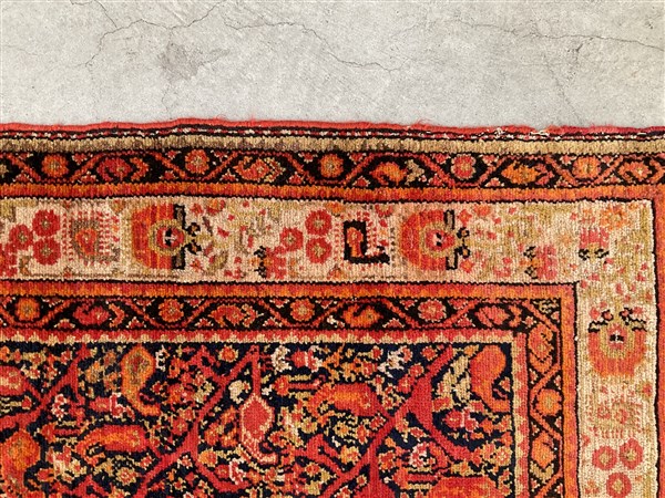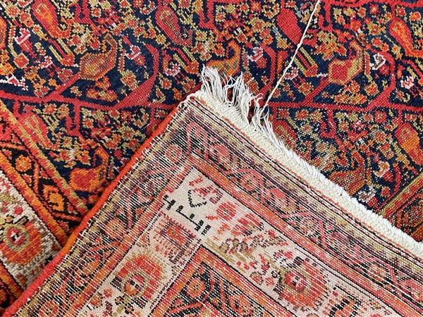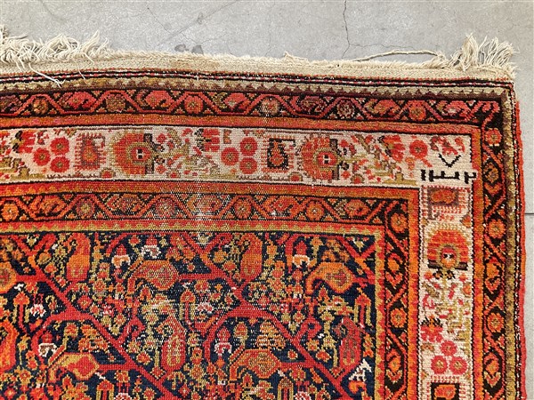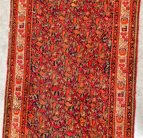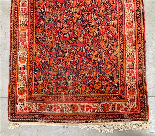 Tappeto passatoia Ferahkan, Persia, inizio secolo XX. Decoro con fasce diagonali di Boteh legati al ramo nei toni del rosso, arancio, giallo e nocciola su fondo blu. Questo motivo decorativo è ripreso dai tessuti Qajar del XIX secolo. Bordura con fiori e Kashmir su fondo bianco. Datato in alto a destra 1320 circa dell'Egira di Maometto (cm 215x370 ca)(difetti e rapature)