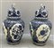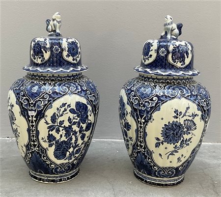 Manifattura del secolo XIX Coppia di vasi con coperchio a decoro bianco e blu (