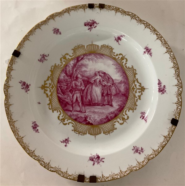 Manifattura francese, fine secolo XIX. Coppia di grandi piatti in porcellana con bordo dorato, cavetto centrato da scena galante nei toni del rosa (d. cm 46) (difetti)