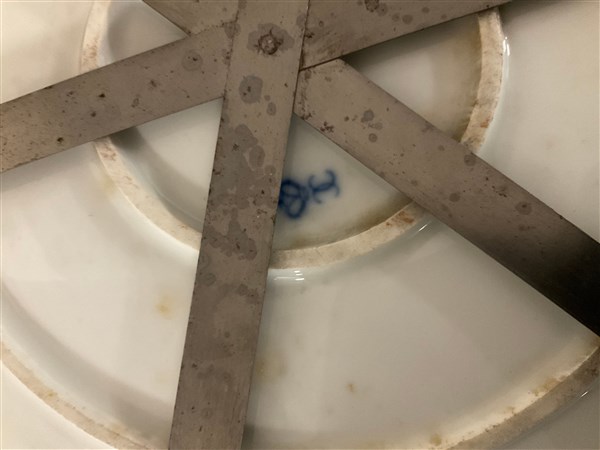 Manifattura francese, fine secolo XIX. Coppia di grandi piatti in porcellana co