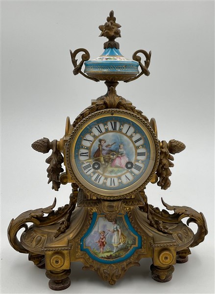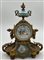 Orologio da appoggio in bronzo dorato e smalti, quadrante smaltato a numeri romani. Movimento a due treni con suoneria delle ore e mezze. Francia, seconda metà secolo XIX (cm 26x32) (difetti)