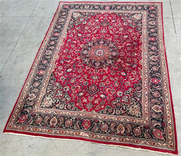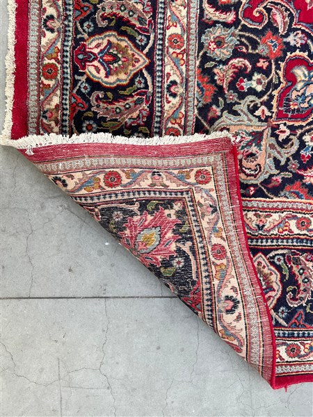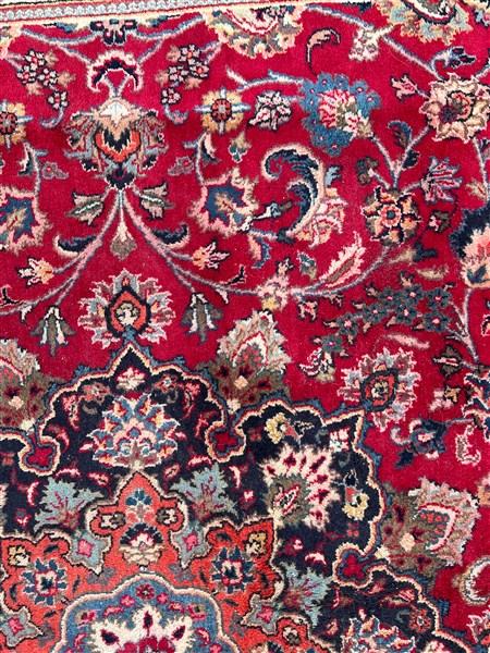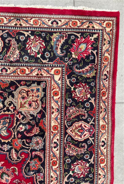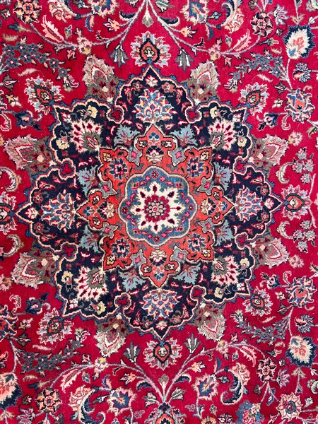 Tappeto Keshan, Persia, secolo XX. Decoro polilobato policromo su campo rosso cosparso di rami fioriti (cm 384x295) (lievi difetti)