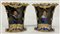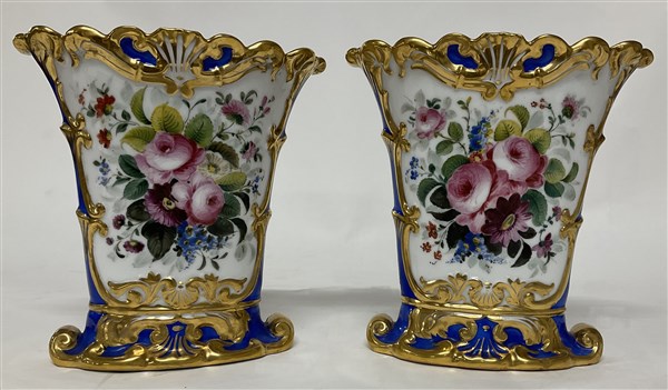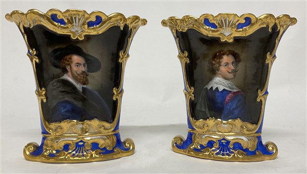 Manifattura francese, coppia di vasi decorati in policromia a volti maschili e fiori con volute dorate (h. cm 22) (difetti)
