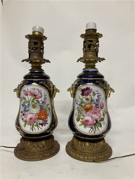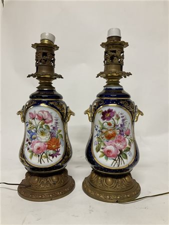 Manifattura francese, coppia di lampade ad una luce decorate in policromia a fiori e volute dorate. Base e ghiera in metallo (h cm 41,5) (difetti)
