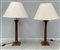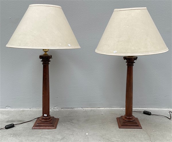 Coppia di candelieri a colonna in legno con capitelli intagliati a foglie d'acanto, con paralumi, (h cm 53) (difetti)