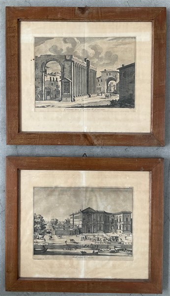 Coppia di acqueforti raffiguranti colonne di San Lorenzo e Collegium Helvetico, (cm 45 x 55) in cornici (difetti)
