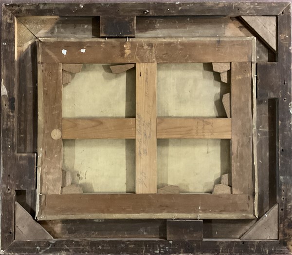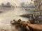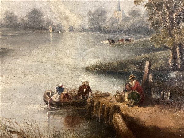 Ignoto del XIX Secolo "Paesaggio fluviale con figure" olio su tela (cm 42x51) Al retro: iscrizione.In cornice