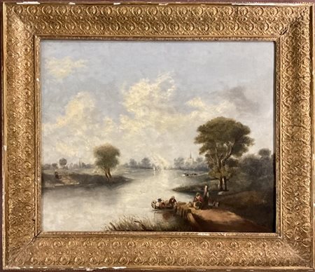 Ignoto del XIX Secolo "Paesaggio fluviale con figure" olio su tela (cm 42x51) A