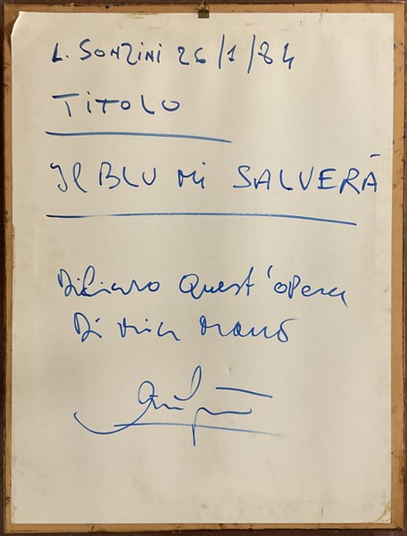 Luigi Sonzini "Il blu mi salverà" tecnica mista su tessuto (cm 70x48) firmato, d