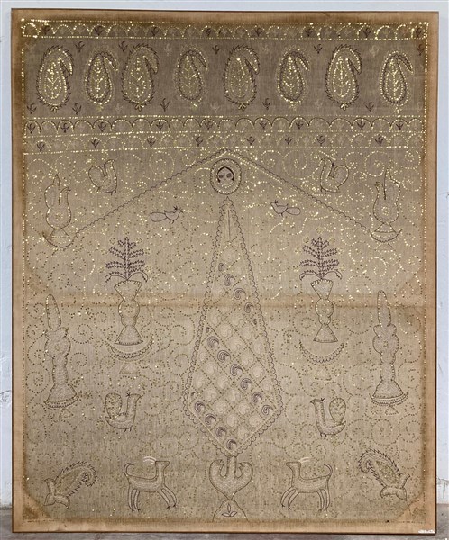 Arazzo, India, fine secolo XIX. Eseguito con ricami in seta e applicazioni di p
