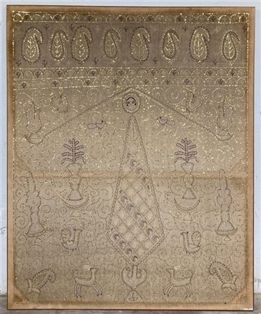 Arazzo, India, fine secolo XIX. Eseguito con ricami in seta e applicazioni di pailletes a formare un Mirab con ai lati due acquamanili, decorato con un grande cipresso centrale, animali, fiori e volute (cm 184x155) (difetti e mancanze)