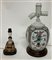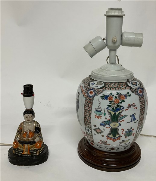 Giara in porcellana Famiglia Verde decorata con oggetti preziosi e figure femminili, montata a paralume, base in legno unita ad una scultura in porcellana raffigurante biddha montata anch'essa a lampada