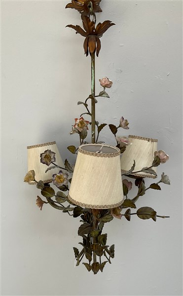 Lampadario a tre luci in ferro battuto decorato a rami di rose fogliati (h. cm