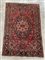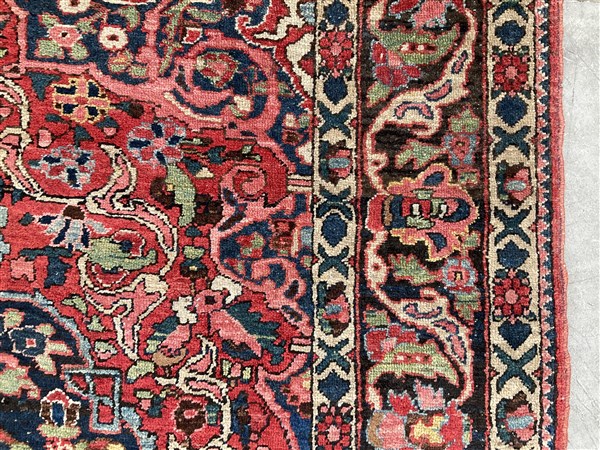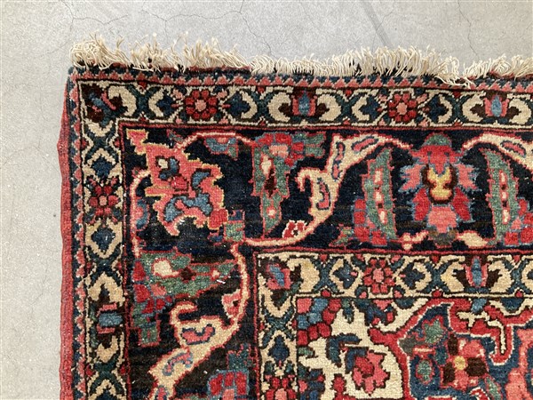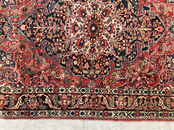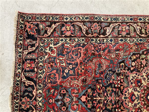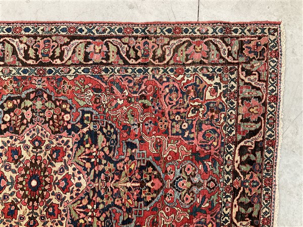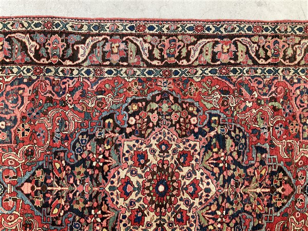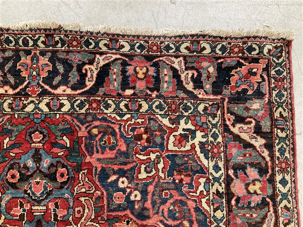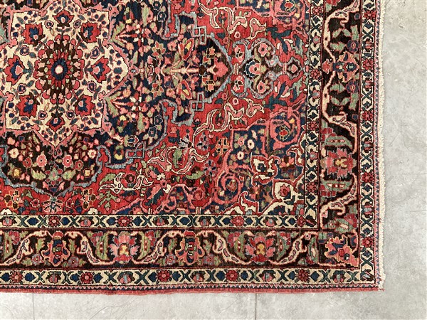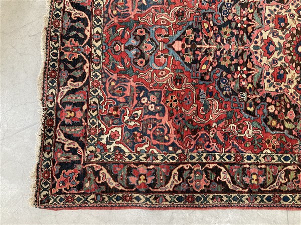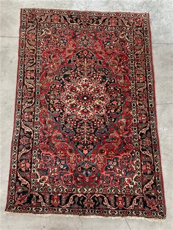 Tappeto Bachtiari, Persia, prima metà del secolo XX. Decoro con medaglione floreale policromo con fondo bianco e blu notte su campo rosso. Bordura a meandro su fondo blu notte (cm210x140 ca) (difetti)