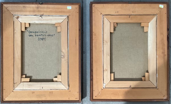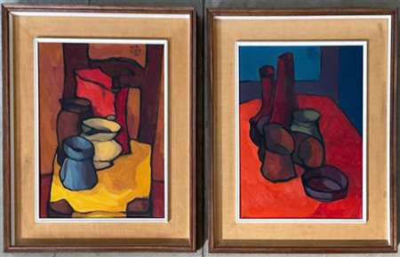 Lotto composto da due oli su tela raffiguranti nature morte con ciotole e vasi (cm 40x30) firmati e datati in alto 1969, uno titolato al retro