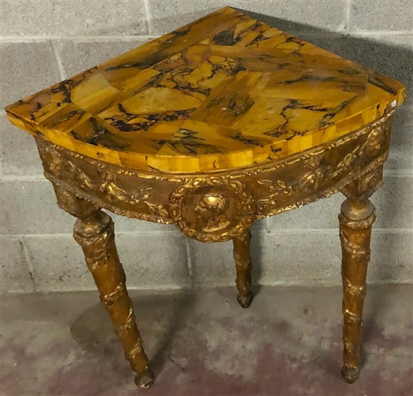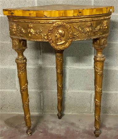 Consolle ad angolo in legno e pastiglia dorato, fronte decorato da mascheroni e rami con bacche. Piano lastronato in marmo. Secolo XVIII (cm 50x90x42) (difetti e restauri)