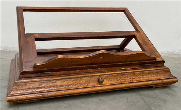 Leggio in legno intagliato con cassettino sottopiano (cm 42x5x33) (difetti)