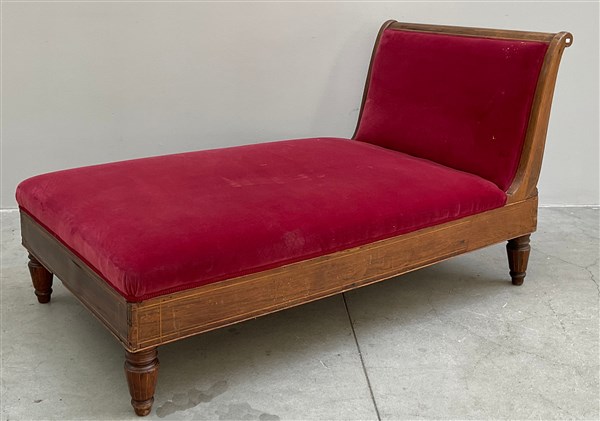 Chaise longue in legno intagliato e filettao ricoperto in velluto. Gambe scanalate (cm 134x74x75) (difetti)